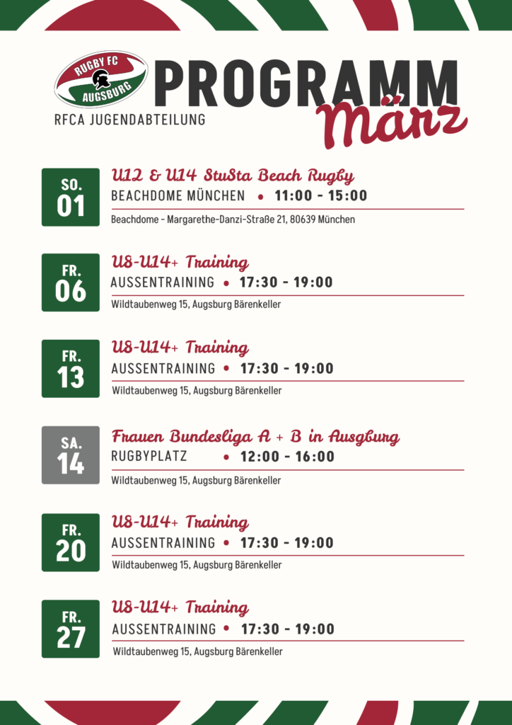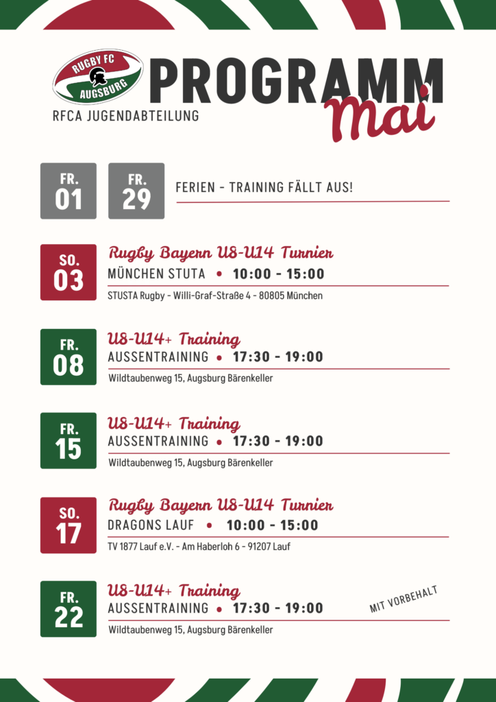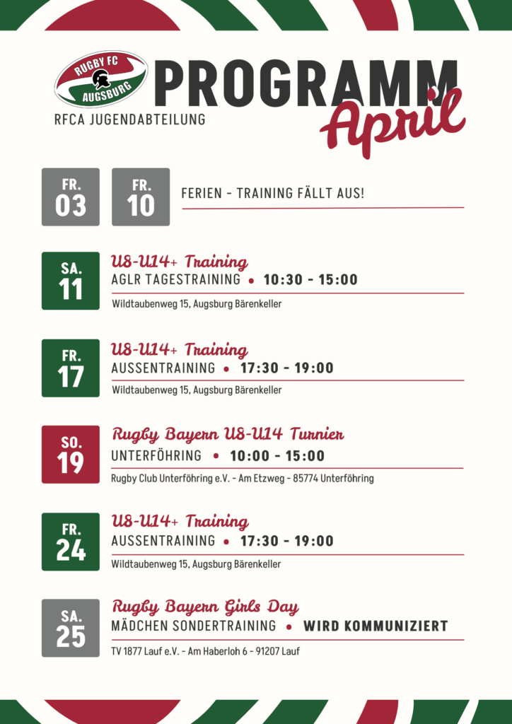 Bist du neugierig und magst du Rugby ausprobieren? Dann melde dich bei uns an jugend@rfca.de oder in unserer WhatsApp gruppe für Neuspieler.